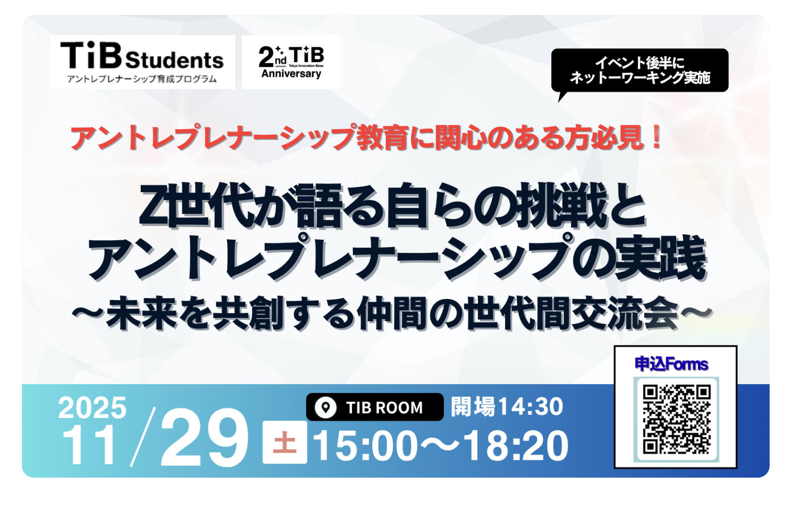 11/29(土)TIB Anniversary Weekイベント 『Z世代が語る自らの挑戦とアントレプレナーシップの実践~未来を共創する仲間の世代間交流会~』