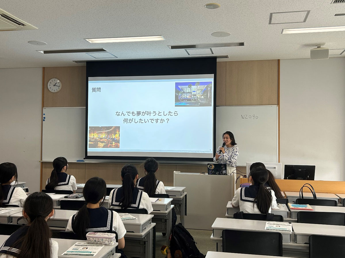 講義では、自身の中高生時代の過ごし方や、大学・社会人生活でのチャレンジ、現在の取り組みについて具体的にお話しいただきました。また、将来について考えるワークを取り入れ、生徒たちが自分自身の夢や課題意識を深める時間を設けました。そして、「その時々で何かにチャレンジし、集中して取り組むことの大切さ」について、熱く語り掛けてくださいました。